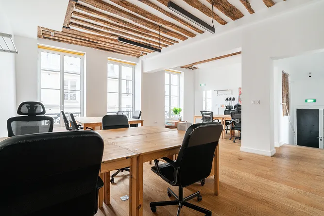 Au cœur du 2e arrondissement, l’Espace Sentier offre 100 m² de bureaux ouverts, avec accès à des espaces partagés et une terrasse, idéal pour une équipe de 16 personnes.